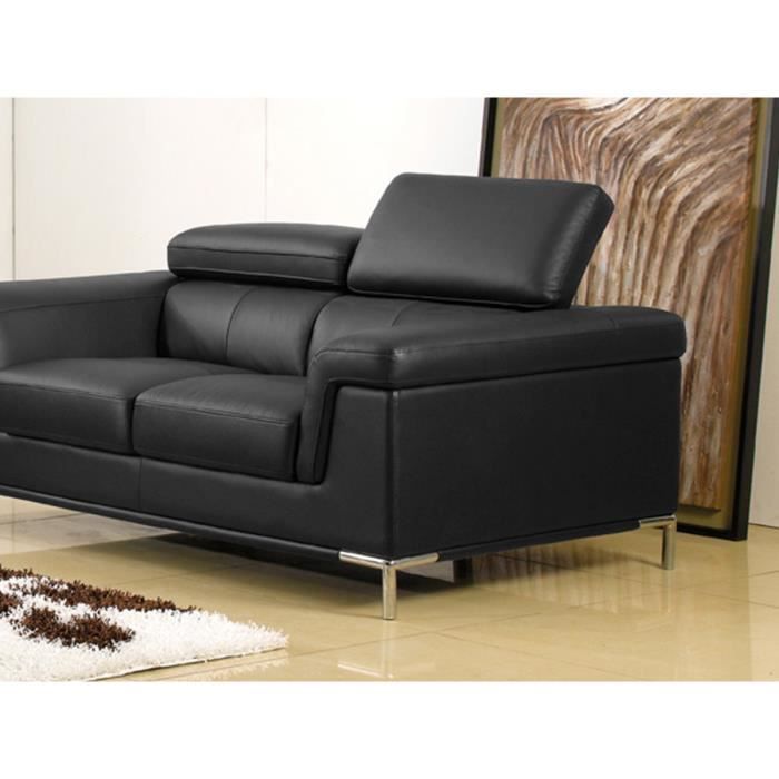 escription canapé 2 places en cuir supérieur noir RANIA : Que vous recherchiez le confort ou le design, le canapé noir 2 places en cuir RANIA vous séduira et comblera toutes vos attentes. Grâce à son piétement métallique original et chic, ce canapé en cuir apportera à votre salon une touche de modernité. Ses appuie-têtes relevables et réglables vous confèreront un confort maximal pour de longues heures de détentes.