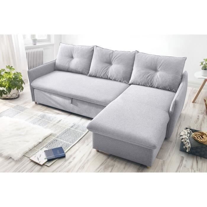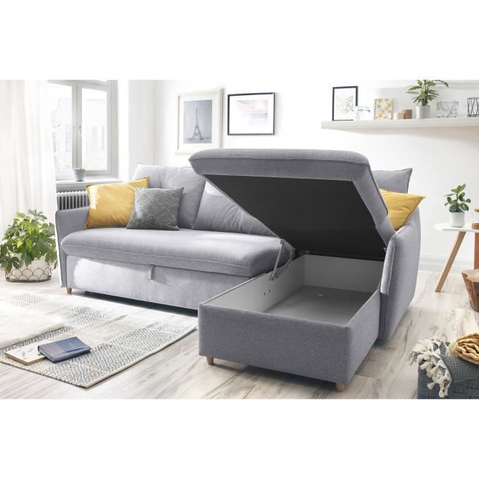 canapé OSTEN angle convertible et réversible, tissu gris 100% polyester 220gr/m2, chaise longue avec coffre de rangement, poche de rangement sur le côté de l’accoucoir, mousse polyuréthane 25kg/m3 et ressort nosag sur l’assises, dossier mousse polyuréthane 21kg/m3, Fibre polyester 150gr/m2