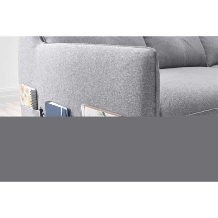 Scandinave et pratique, le canapé d’angle réversible convertible OSTEN vous permettra de changer le côté de l’angle comme bon vous semble. Sa fonction convertible qui s’active en quelques secondes pour transformer le canapé en lit vous permet d’accueillir des invités avec son grand couchage 140 x 220 cm. Soyez charmé par son petit plus : des poches accoudoir pour ranger vos magazines et télécommandes ainsi que son coffre de rangement ultra pratique.