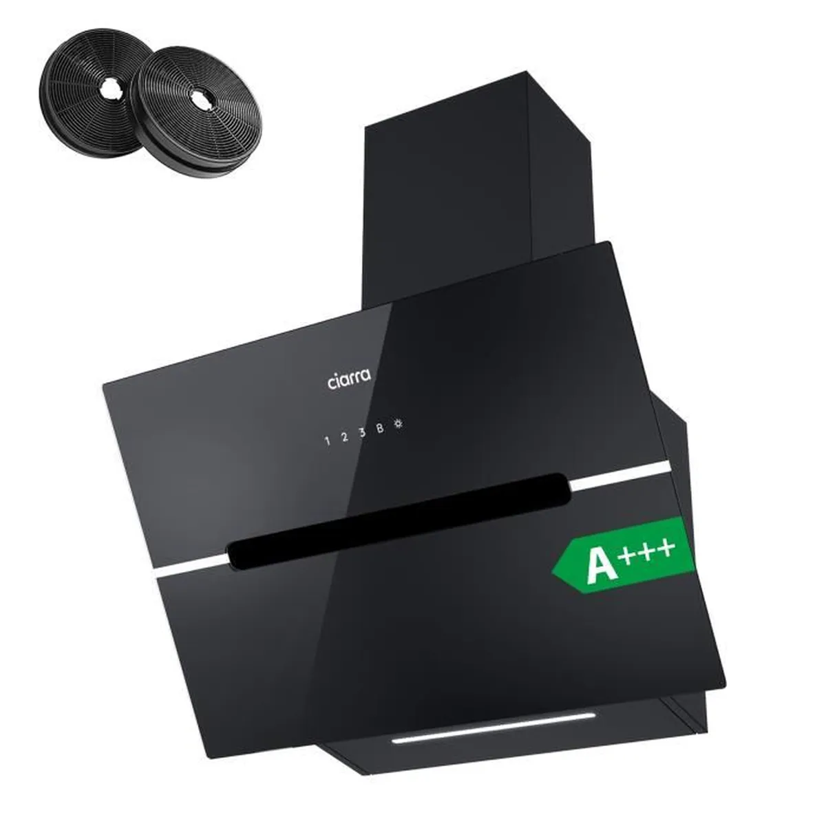 CIARRA CD6736FB Hotte murale tactile, largeur de 60cm, haut débit d’extraction max 650 m3/h mais au faible niveau sonnore de 44- 62 dB (en mode intensif). 4 vitesses; Opération à distance depuis votre appareil mobile pour libérer vos mains; Classe d’énergie A+++, faible consommation électique: 10 kwh/an. Filtres au charbon inclus.