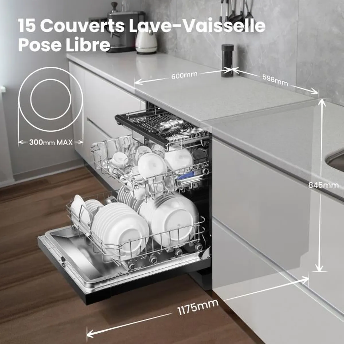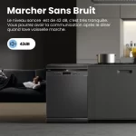 Lave-vaisselle pose libre 84.5*59.8*60 cm- Niveau sonore :42db- Capacité : 15 couverts- Classe énergétique D- 8 programmes – moteur induction- Durée du cycle de lavage standard 90mins-Semi Charge-Lavage rapide 30min-Dark Inox