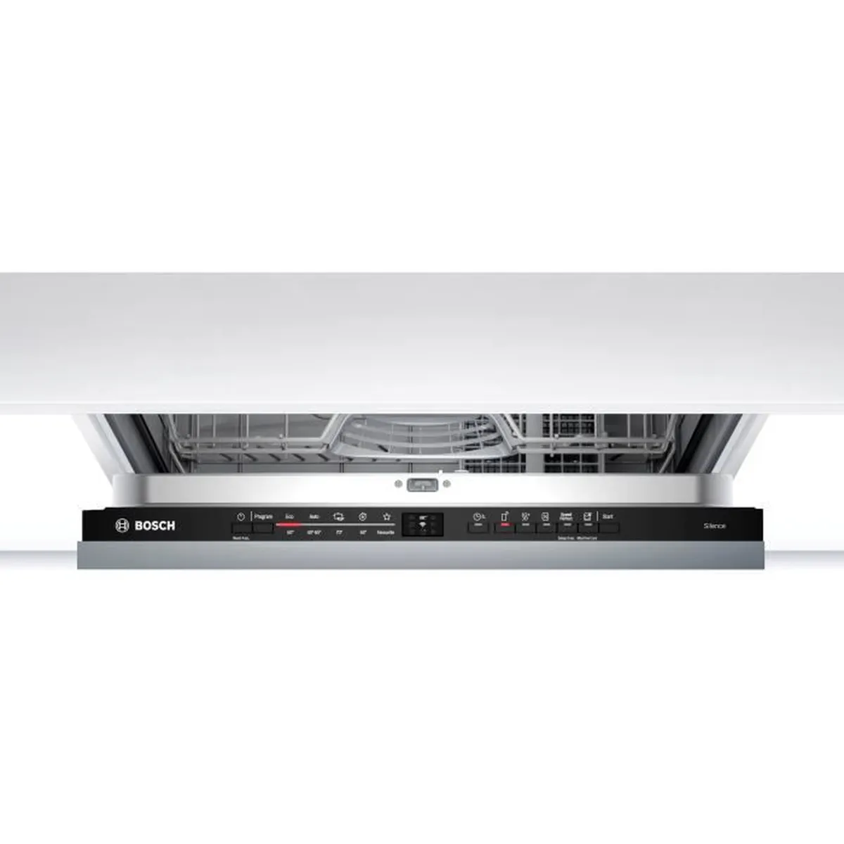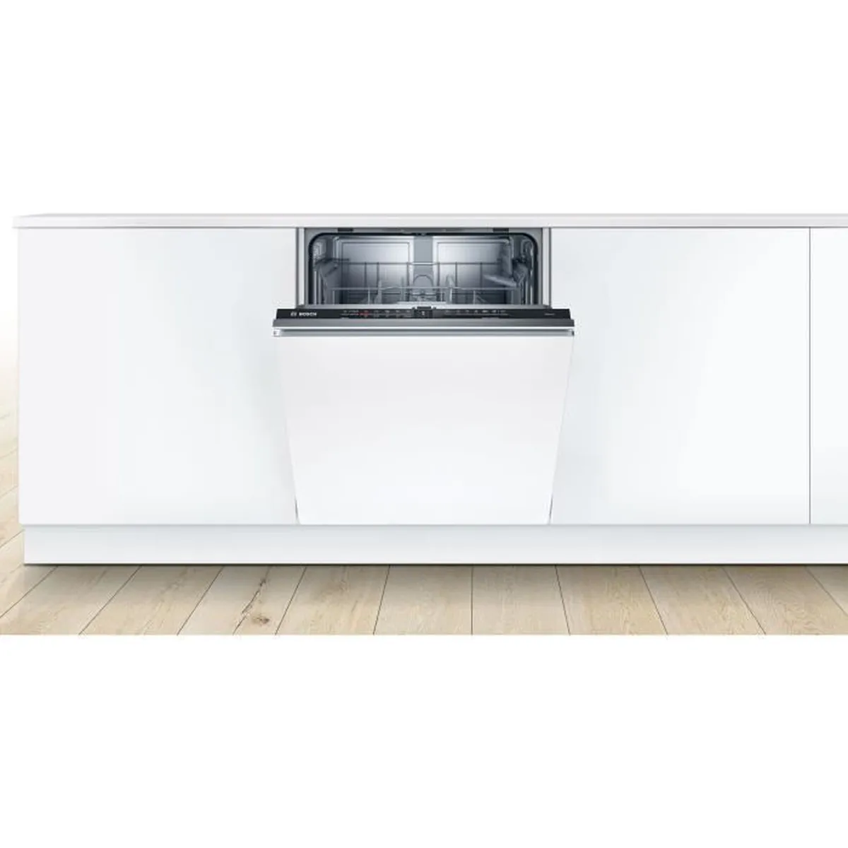 BOSCH-Lave-vaisselle 60cm tout intégrable-SER2-Classe énergie E-Conso.énergie pour100 cycles Eco:92 kWh-Durée progr.Eco:4h30-Conso.d’eau :10,5l-Classe d’efficacité sonore C-48 DB-12 couverts-5 progr.-Cuve: Polinox/acier inox-Home Connect,InfoLight